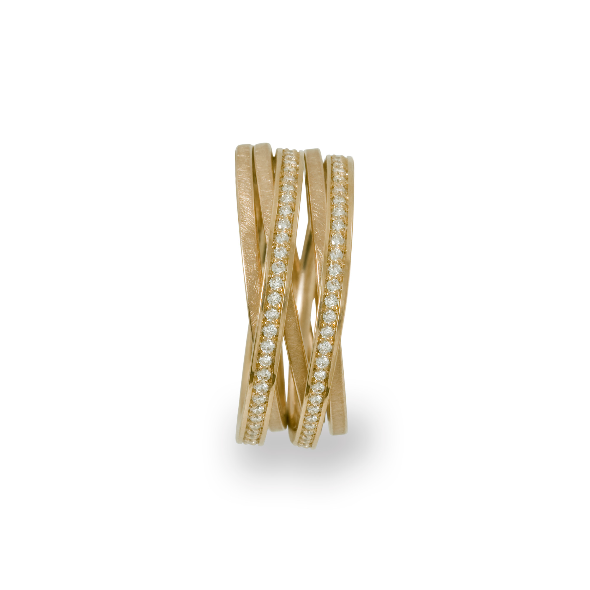 Ref. SR556-GG - Eine fesselnde Idee: Eine Kette wird zum Ring gewickelt. Ein Spielzeug für Frauen, das fasziniert und Spaß macht. 5 oder 7 Ringe greifen ineinander, breiten sich aus oder wachsen zusammen. Sie werden eingefädelt und ausgefädelt – Schmuck, der zum Erlebnis wird, natürlich auch mit Brillanten und Gebrauchsanleitung.