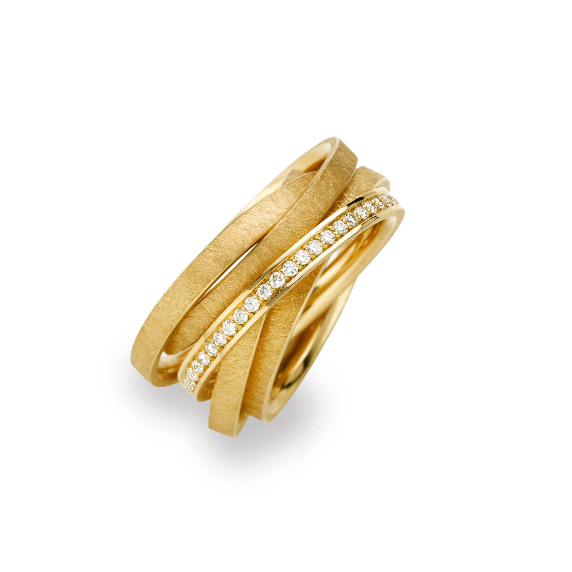 Ref. SR755-GG - Eine fesselnde Idee: Eine Kette wird zum Ring gewickelt. Ein Spielzeug für Frauen, das fasziniert und Spaß macht. 5 oder 7 Ringe greifen ineinander, breiten sich aus oder wachsen zusammen. Sie werden eingefädelt und ausgefädelt – Schmuck, der zum Erlebnis wird, natürlich auch mit Brillanten und Gebrauchsanleitung.